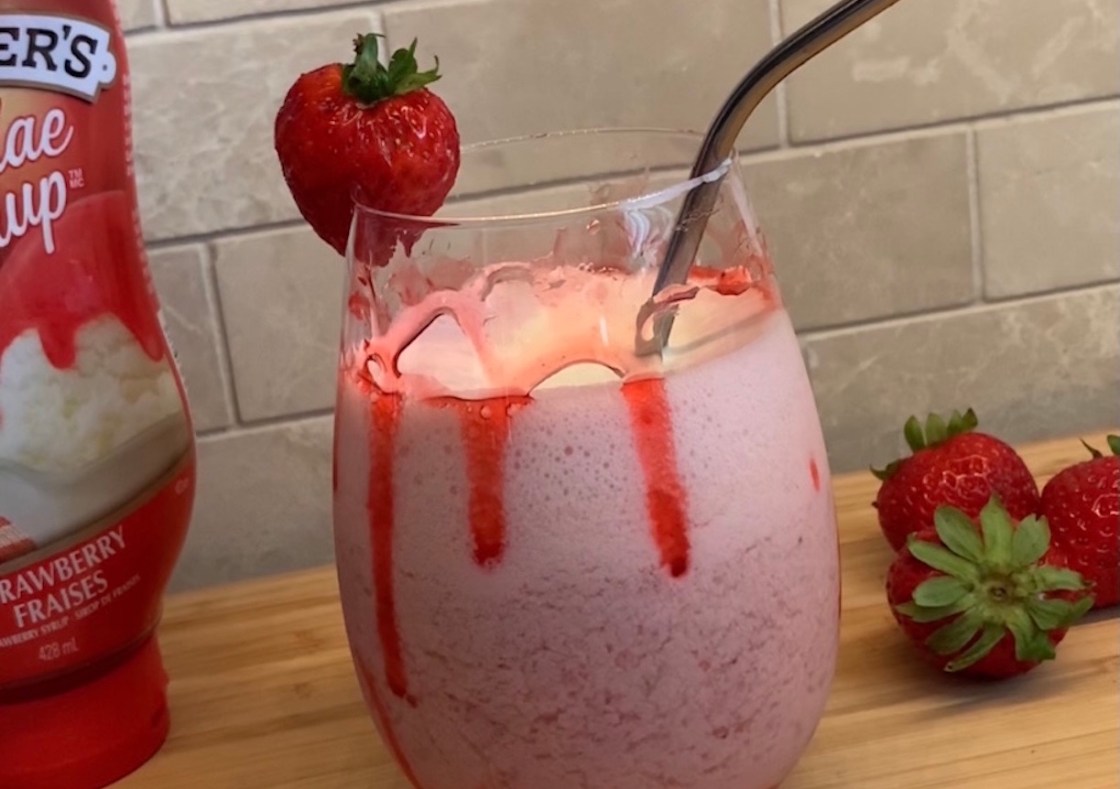 - Line the inside of your serving glass with more strawberry sauce and pour in your beverage.