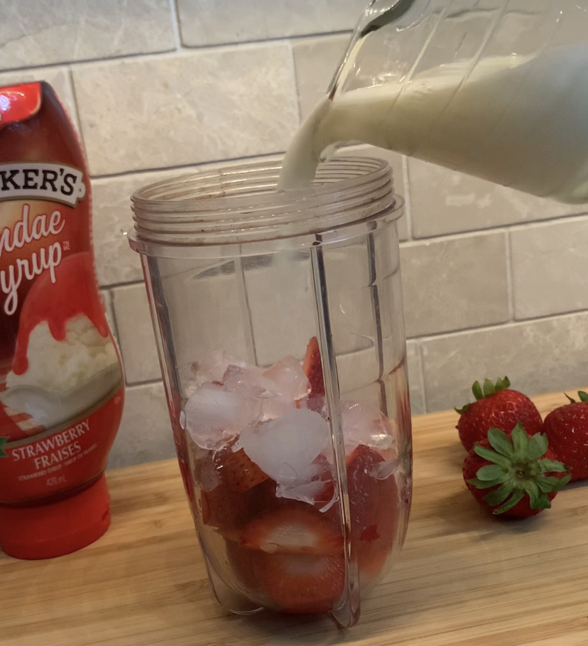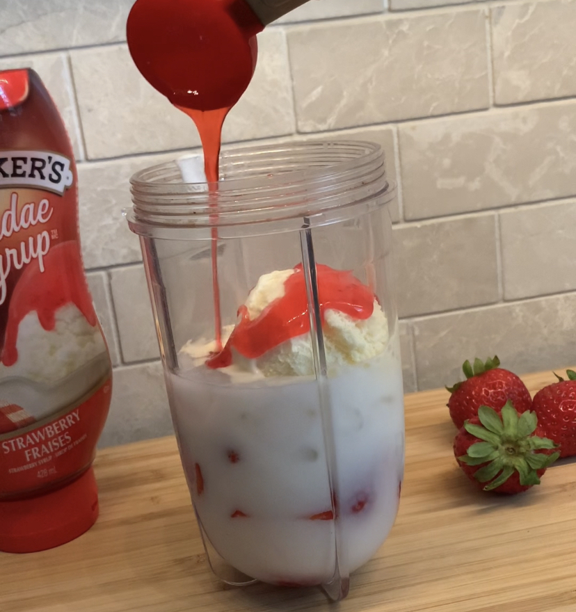 To start, you’ll need to gather your ingredients. This recipe has a short list, namely fresh strawberries, vanilla ice cream, milk, sugar, ice and strawberry sauce. You’ll likely have everything you need for the refreshing drink at home as I devised the recipe based on items I already had in my kitchen. However, if you do need to buy some of these ingredients, rest assured that they’re all super easy to find at your local grocery store and won’t cost you any big bucks.